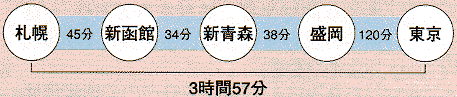 ※札幌・東京間前線フル規格で最高速度350Km/h、表定速度280Km/hただし、東京・大宮間は160Km/h、所要時間を20分として計算した。 ※在来線は、各駅間における停車時間、乗り継ぎ時間を含んだ現行所要時間。(H10.6) ※交通機関を乗り継ぐ場合の所要時間、待ち時間を以下のようにした。 ・空港における鉄道・バスの待ち時間15分 ・空港における航空機の待ち時間25分 ・乗り換え電車等の待ち時間15分 ・札幌駅から新千歳空港までの所要時間36分 ・空港から主要駅までの所要時間(連絡バス利用) 函館空港から函館駅20分、青森空港から青森駅40分、花巻空港から盛岡駅50分 | ||||||||||||||||||||
